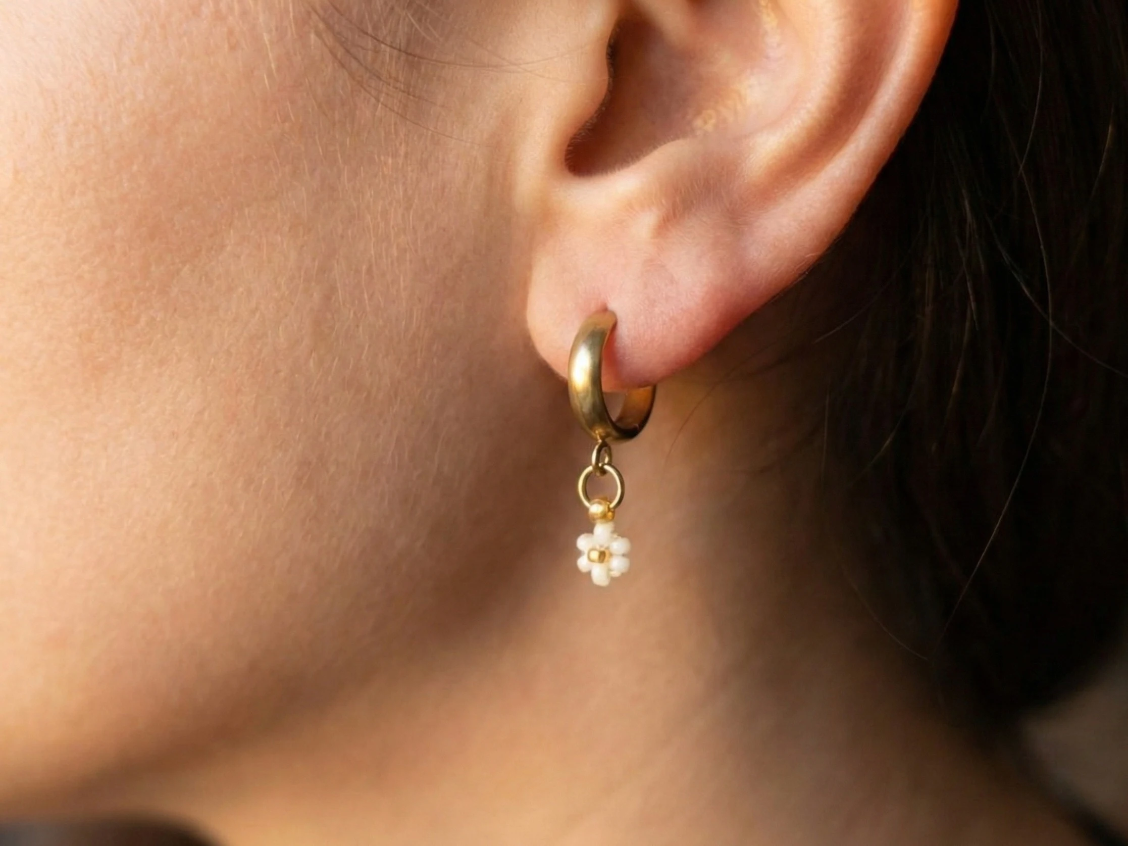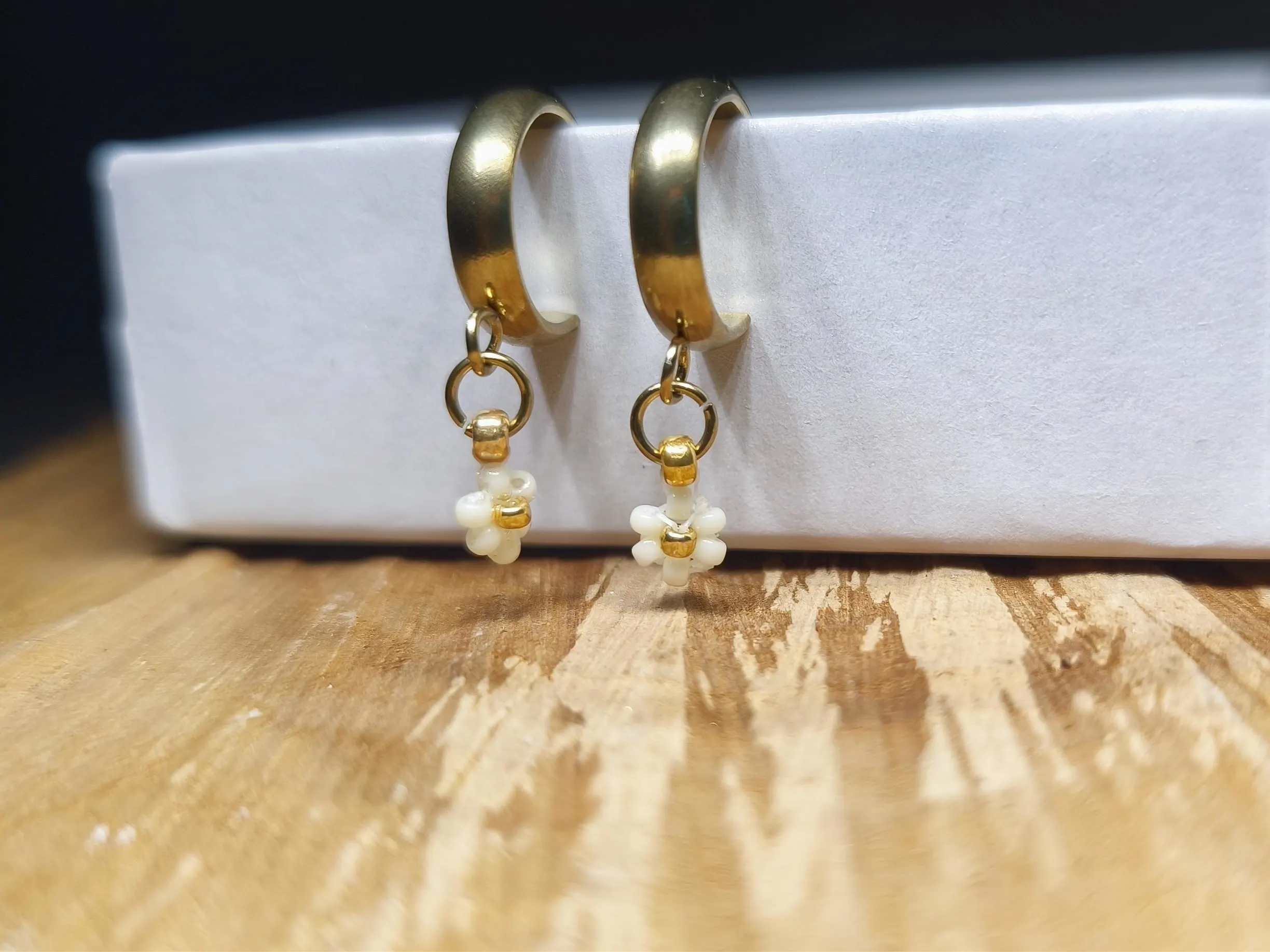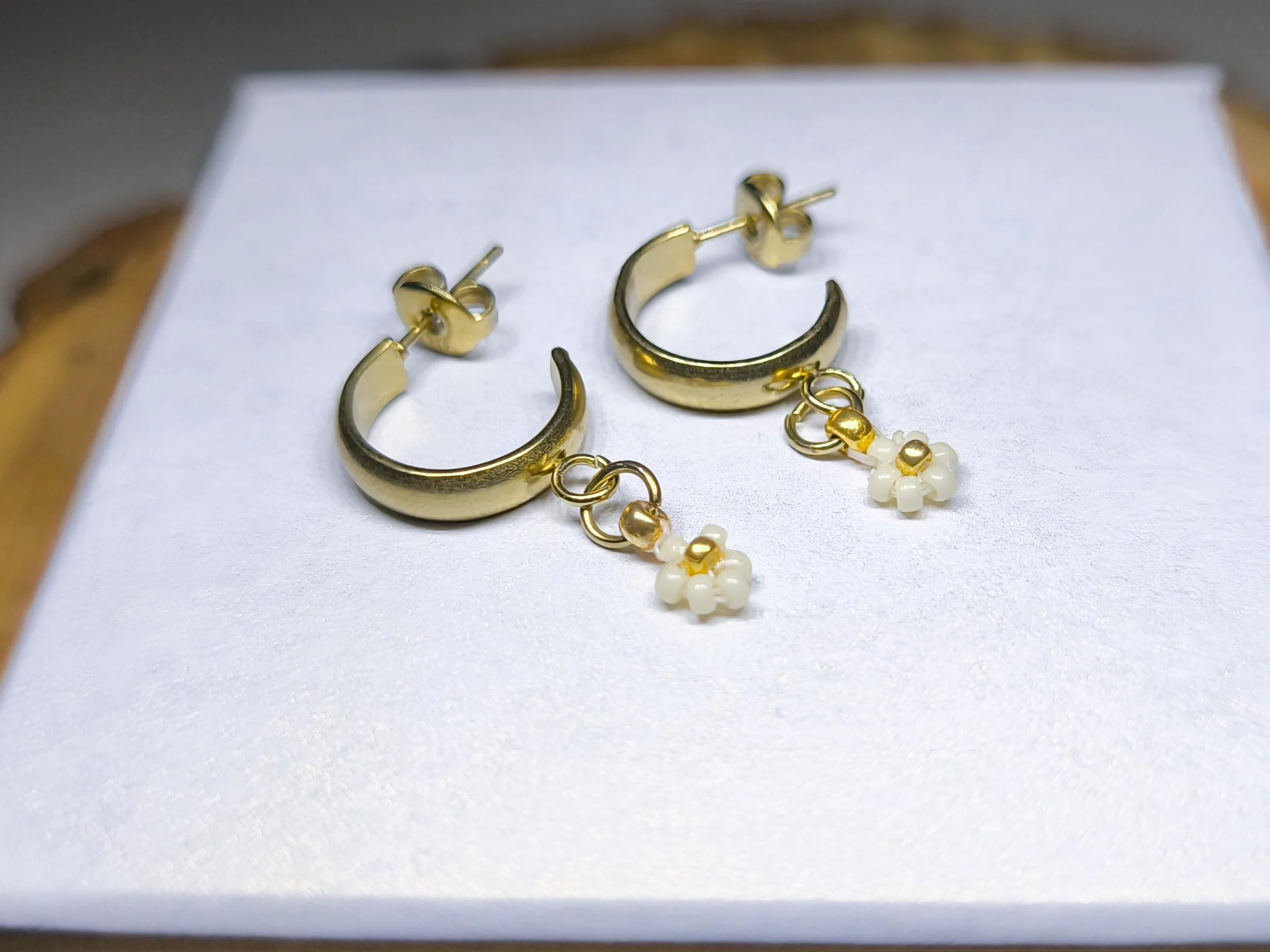 Náušnice kroužky „Sedmikráska“ – PVD Gold, Miyuki. Rozzařte svůj vzhled jemností lučního kvítí s těmito půvabnými náušnicemi „Sedmikráska“. Kombinace zlatého kroužku a drobného bílého kvítku je dokonalým doplňkem, který dodá vašemu dni čistý, svěží a romantický nádech.