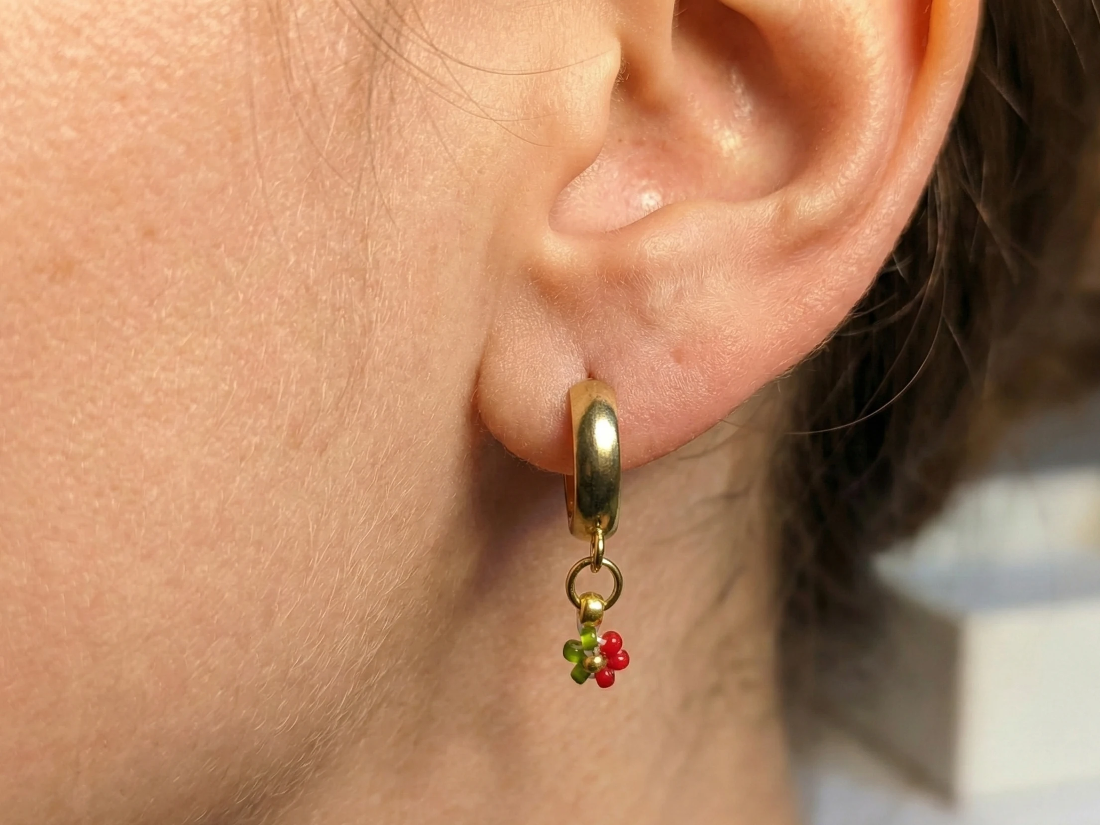 Každý miniaturní kvítek je precizně ručně vyroben ze skleněných japonských korálků Miyuki o velikosti 2-3 mm. Ikonická kombinace sytě červené, lesní zelené a zářivé zlaté barvy symbolizuje radost, naději a domácí pohodu. Celý přívěsek je vytvořen na vysoce pevném vlasci značky Fireline. Pro maximální odolnost a jistotu je šňůra zakončena pevným uzlíkem, zajištěným speciálním lepidlem.