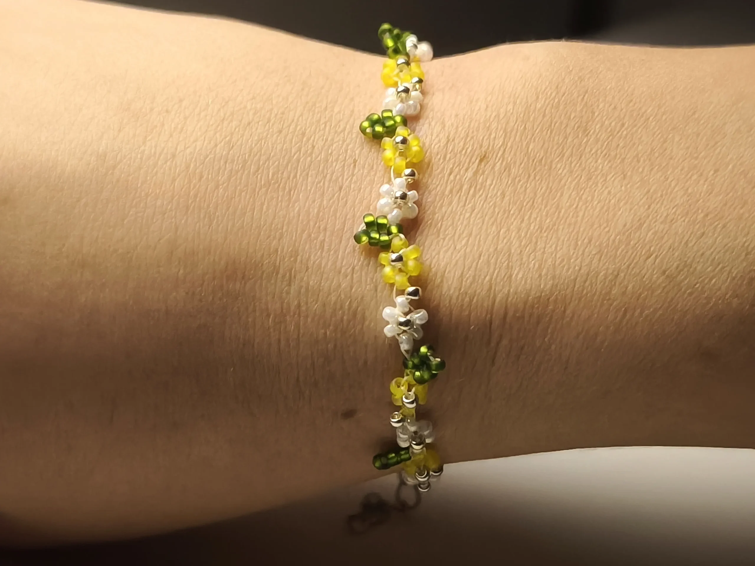 Hra jarních barev: Tělo náramku tvoří pravidelné střídání tří svěžích barev. Zářivě žlutá symbolizuje hřejivé slunce a životní energii, sytě zelená evokuje čerstvou trávu a růst, zatímco čistě bílá přináší do kompozice klid a nevinnost. Všechny tyto drobné kvítky ožívají díky metalickým stříbrným středům, které celý šperk vizuálně a harmonicky propojují s kovovým zapínáním.