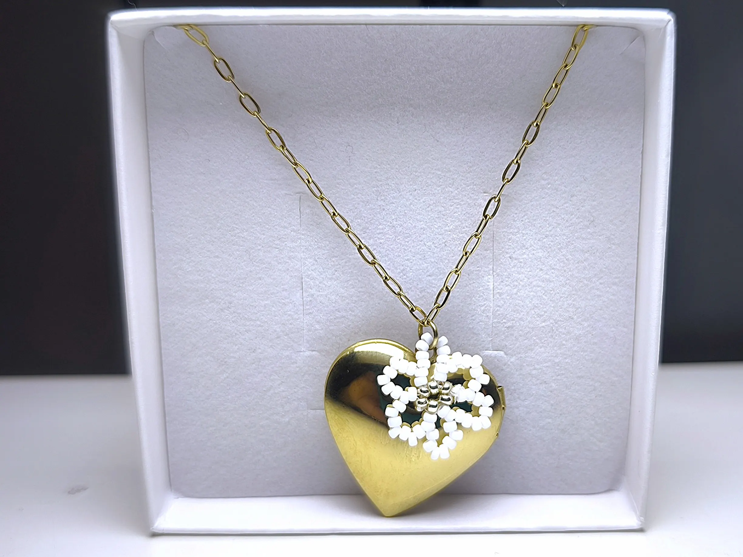 Osobní náhrdelník s medailonkem ve tvaru srdce. Otevírací přívěsek na fotku zdobený ručně vyráběným květem z korálků Miyuki. Pozlacená ocel, vintage styl.