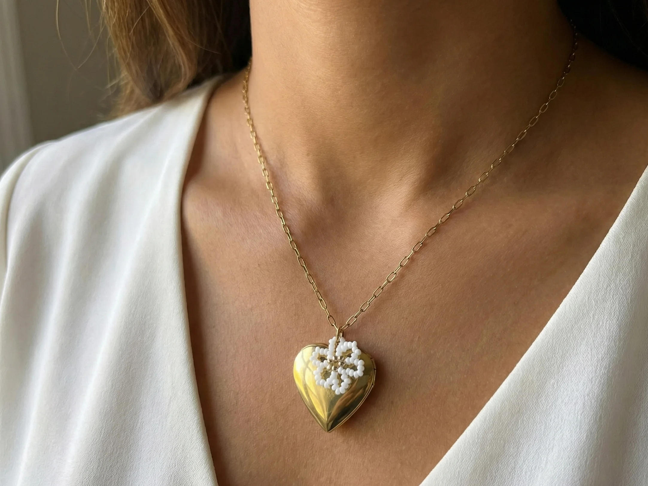 Zvolili jsme čistě bílou barvu korálků v kombinaci se stříbrnými či zlatými detaily. Bílá barva symbolizuje čistotu, nové začátky a naději. Květinový motiv je na kovový podklad fixován s maximální pečlivostí, aby odolal každodennímu nošení. Kontrast mezi tvrdým lesklým kovem a jemnou strukturou skleněných korálků dělá z tohoto kousku nepřehlédnutelný náhrdelník s medailonkem, který upoutá pozornost.
