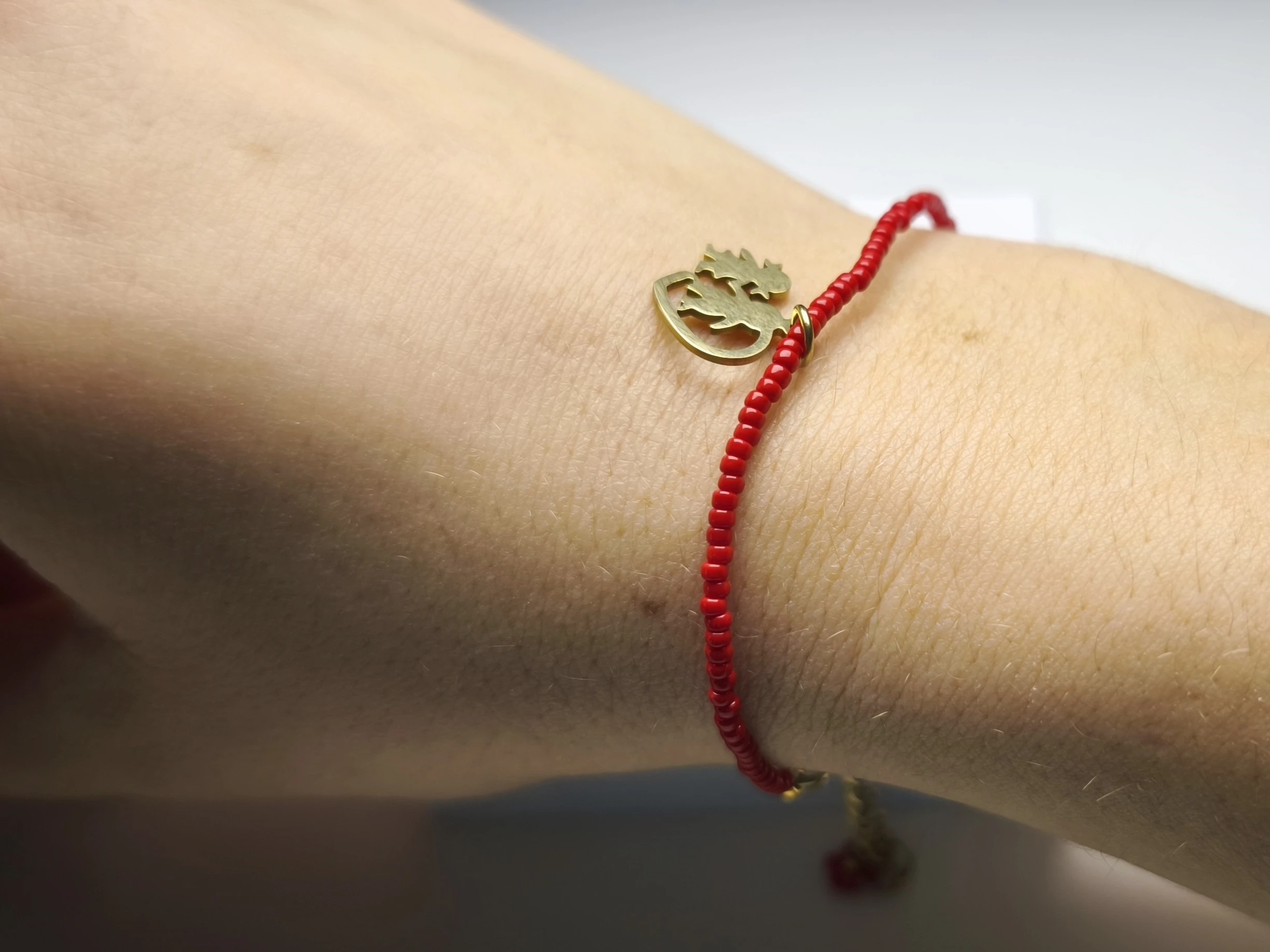 Základ náramku tvoří minimalistická linie sytě červených korálků Miyuki o velikosti 2-3 mm, která působí na zápěstí velmi decentně a elegantně. Hlavní dominantou je zlatý ocelový přívěsek ve tvaru srdce, uvnitř kterého se drží za ruce chlapec a dívka. Jako roztomilý detail je u zapínání přidán drobný korálkový kvítek. Náramek je navlečen na vysoce pevném vlasci značky Fireline, zakončeném pevným uzlíkem a zajištěným speciálním lepidlem.