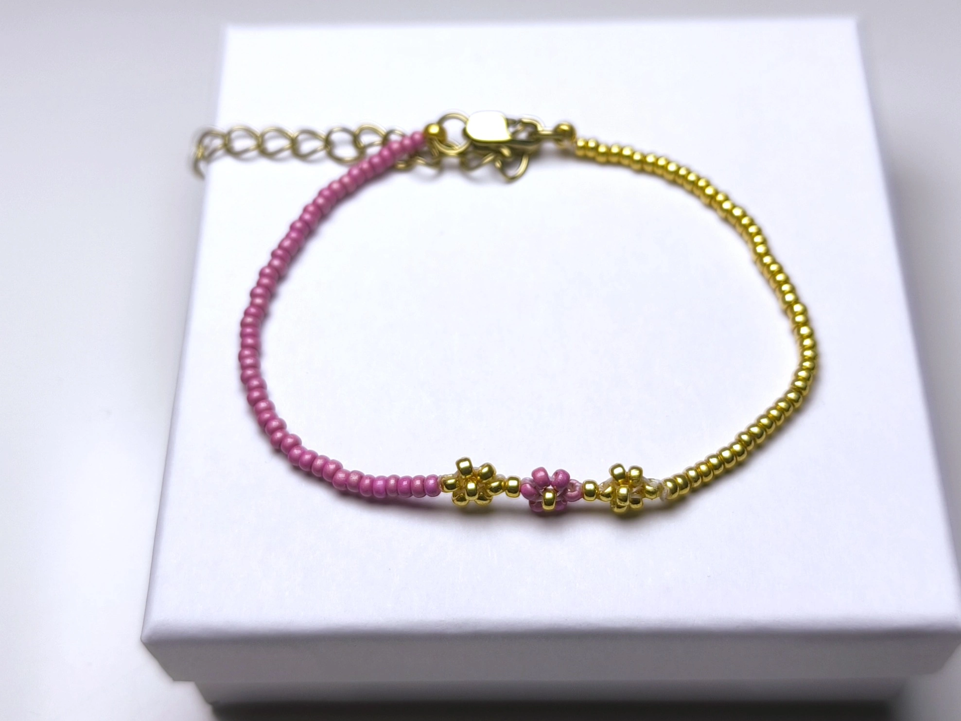 • Místo setkání: Ve středu náramku se tyto dvě cesty potkávají. Není zde velký přívěsek, ale jemný motiv tří drobných kvítků – zlatého, růžového a opět zlatého. Je to symbolický bod, kde se dva světy spojují v jeden harmonický celek.