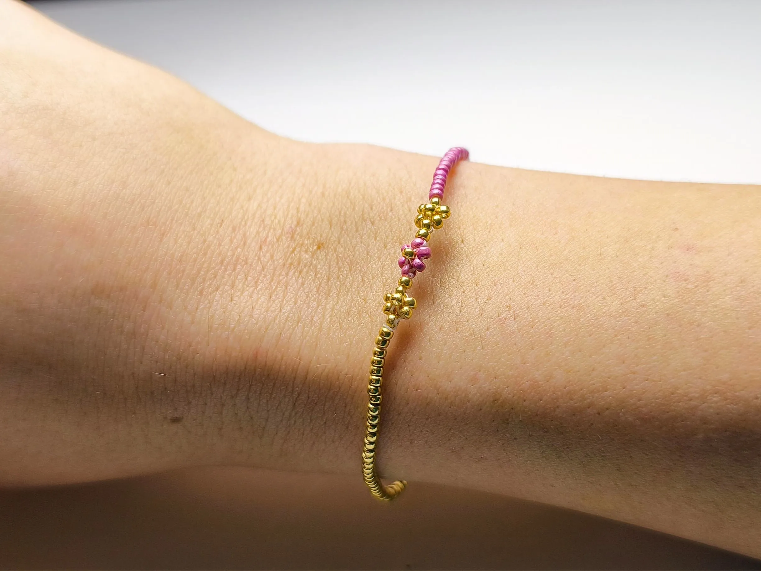 Moderní náramek pro ženy s asymetrickým designem. Ručně vyráběný šperk z korálků Miyuki v kombinaci růžové a zlaté. Pozlacená ocel, nastavitelná velikost.