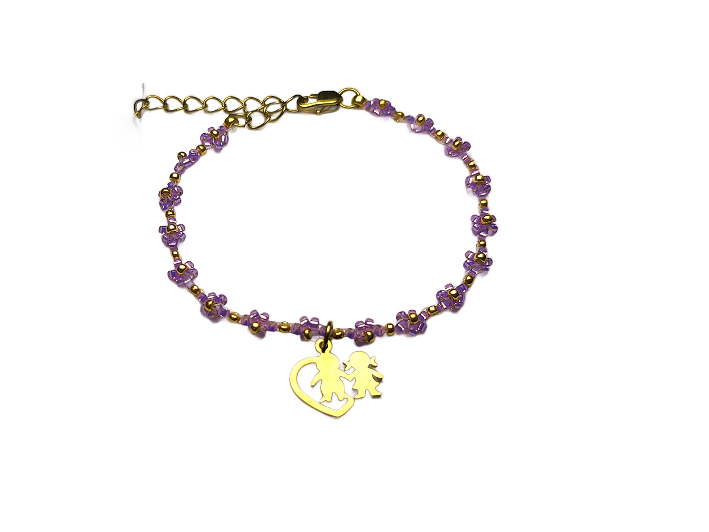 Dominantou tohoto šperku je nádherný zlatý ocelový přívěsek ve tvaru srdce. Není to ale jen prázdný tvar. Uvnitř jemné kontury se drží za ruce siluety chlapce a dívky. Tento detail dělá z náramku ideální dárek pro maminky, babičky nebo tety.