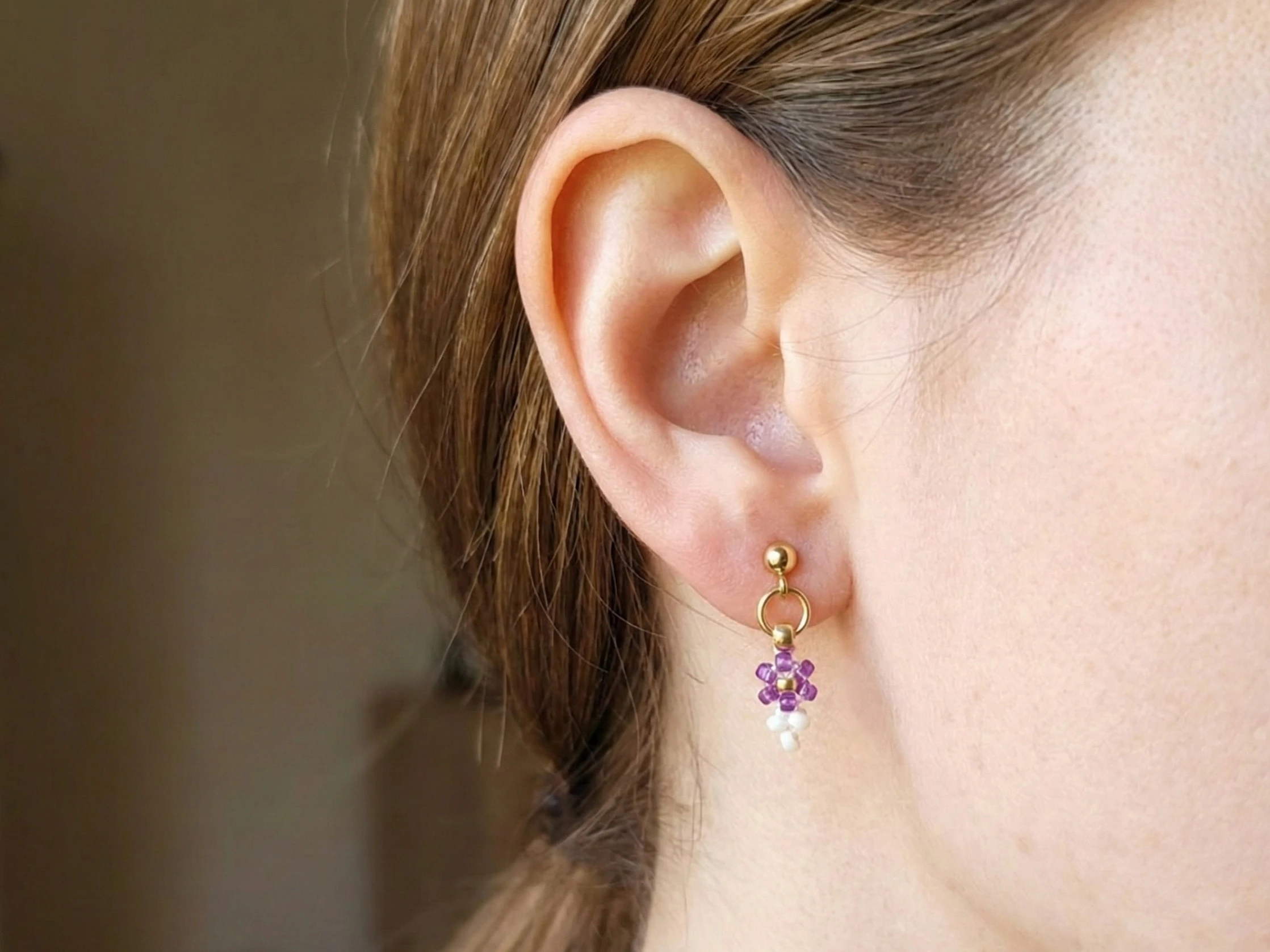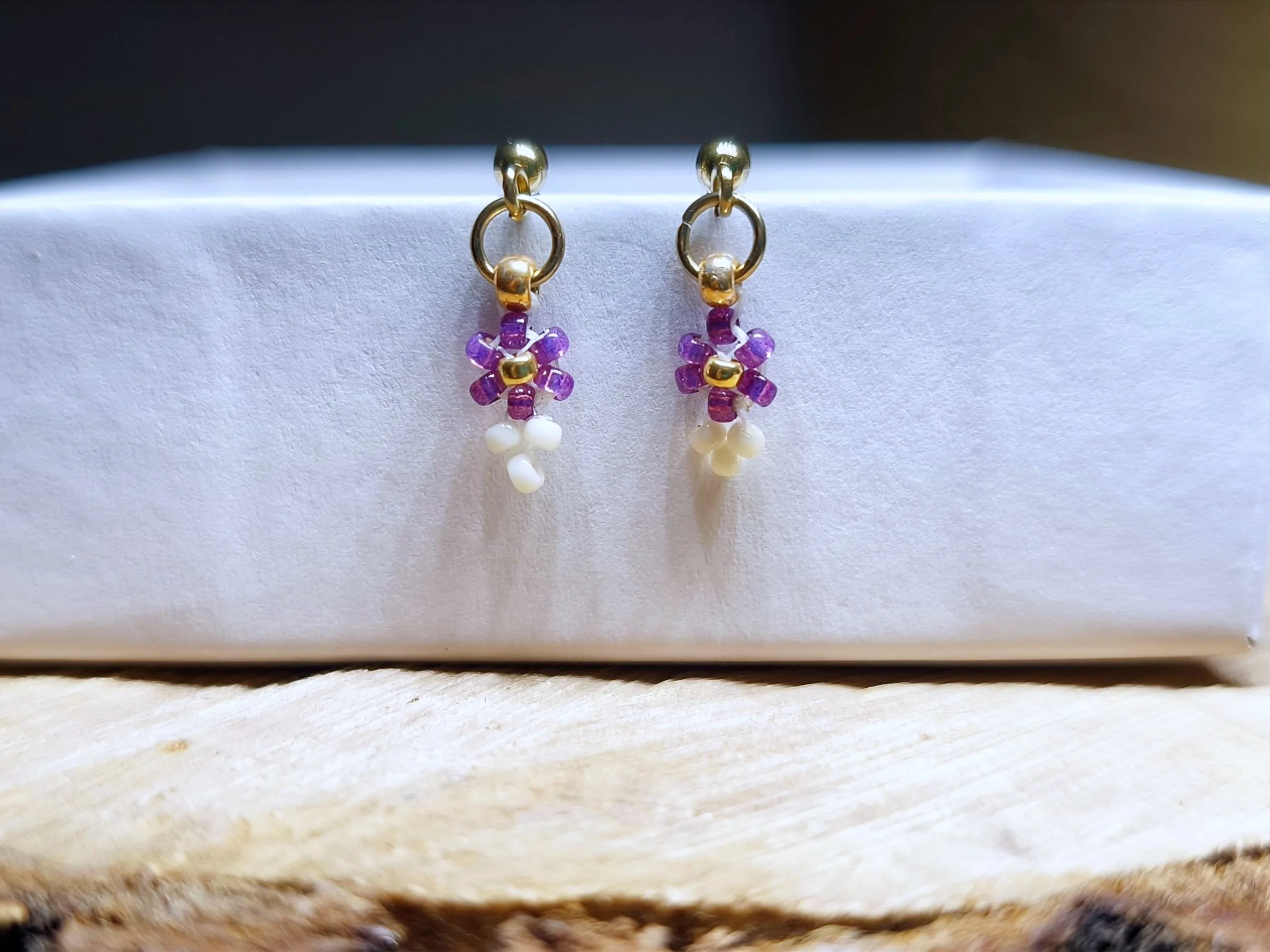 Každý miniaturní kvítek je precizně ručně vyroben ze skleněných japonských korálků Miyuki o velikosti 2-3 mm v sytě fialové, krémové a zlaté barvě. Celý přívěsek je vytvořen na vysoce pevném vlasci značky Fireline. Pro maximální odolnost a jistotu je šňůra zakončena pevným uzlíkem, zajištěným speciálním lepidlem.