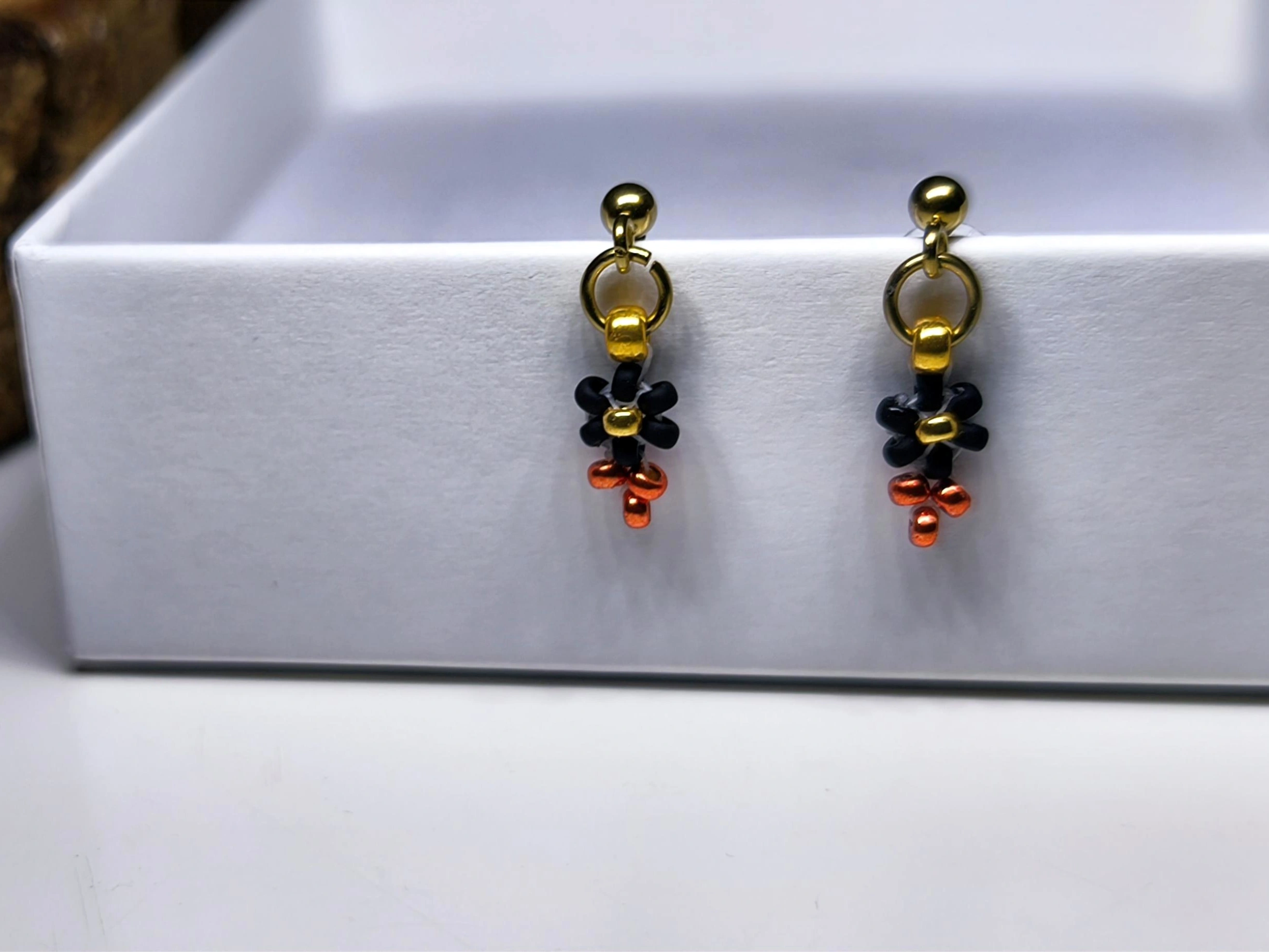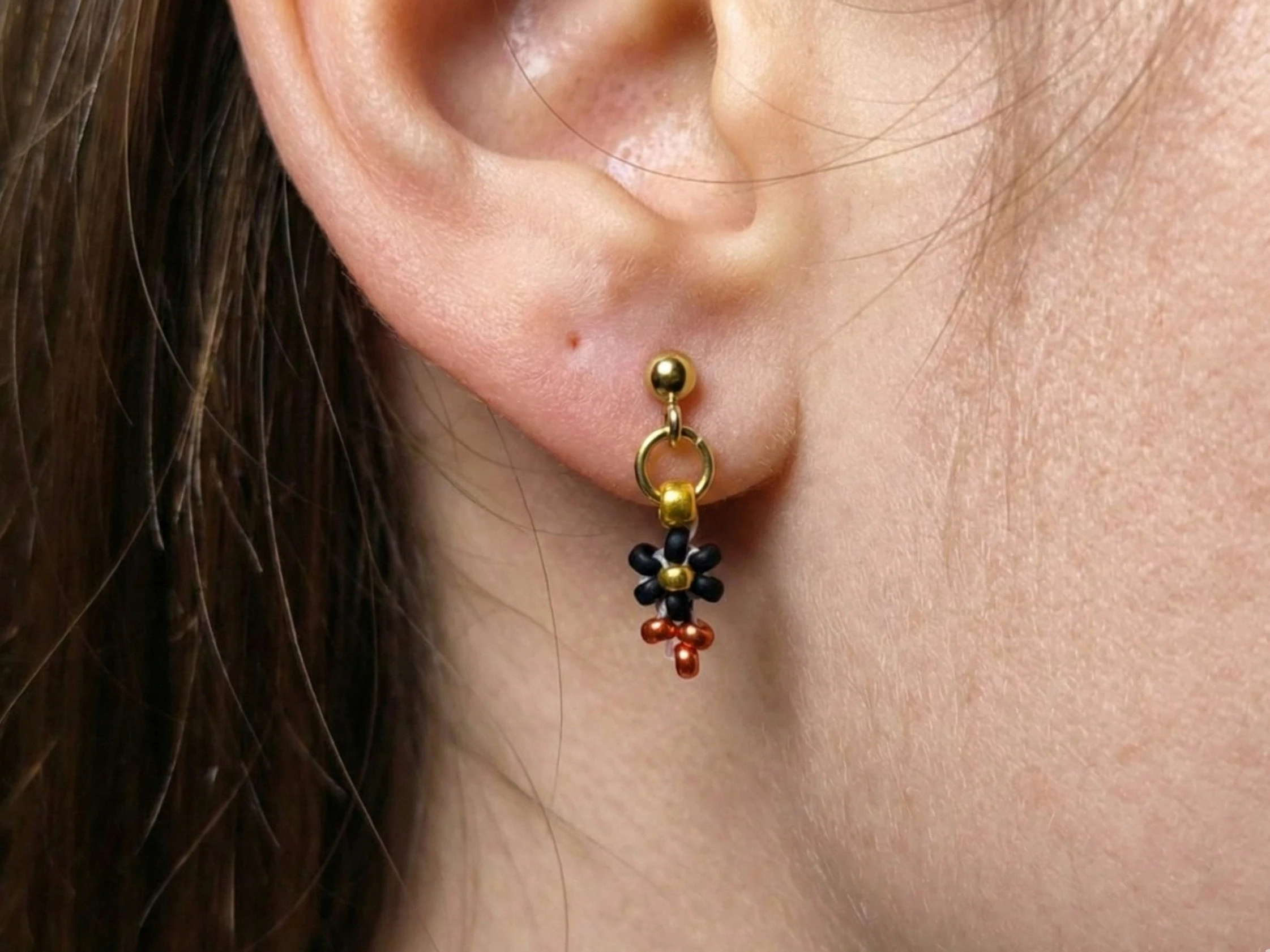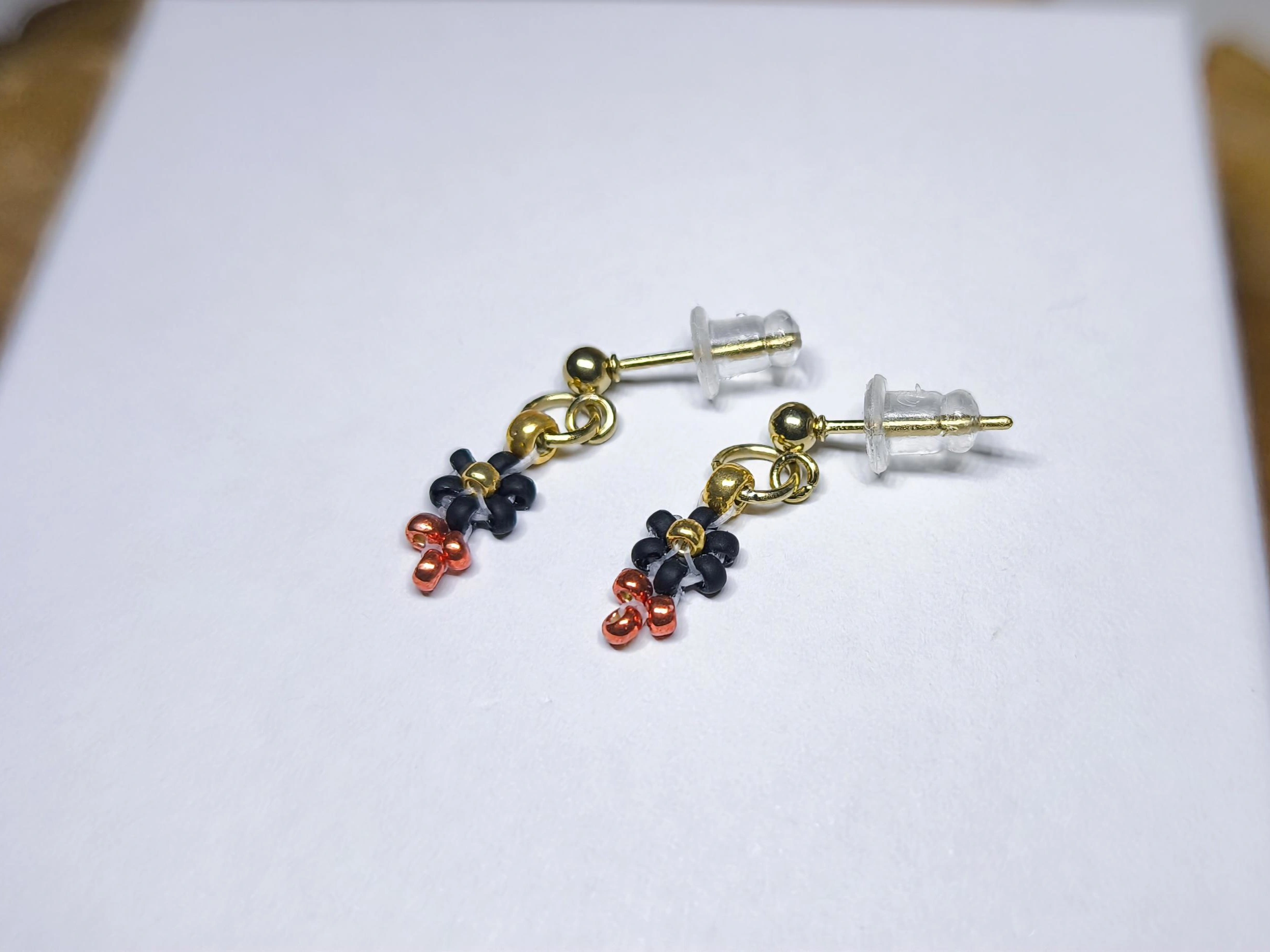 Každý miniaturní kvítek je precizně ručně vyroben ze skleněných japonských korálků Miyuki o velikosti 2-3 mm. Elegantní černá barva je ve spodní části doplněna o metalické měděné (rezavé) korálky, které na světle krásně září. Střed kvítku je zdoben zlatou barvou. Celý přívěsek je vytvořen na vysoce pevném vlasci značky Fireline. Pro maximální odolnost a jistotu je šňůra zakončena pevným uzlíkem, zajištěným speciálním lepidlem.