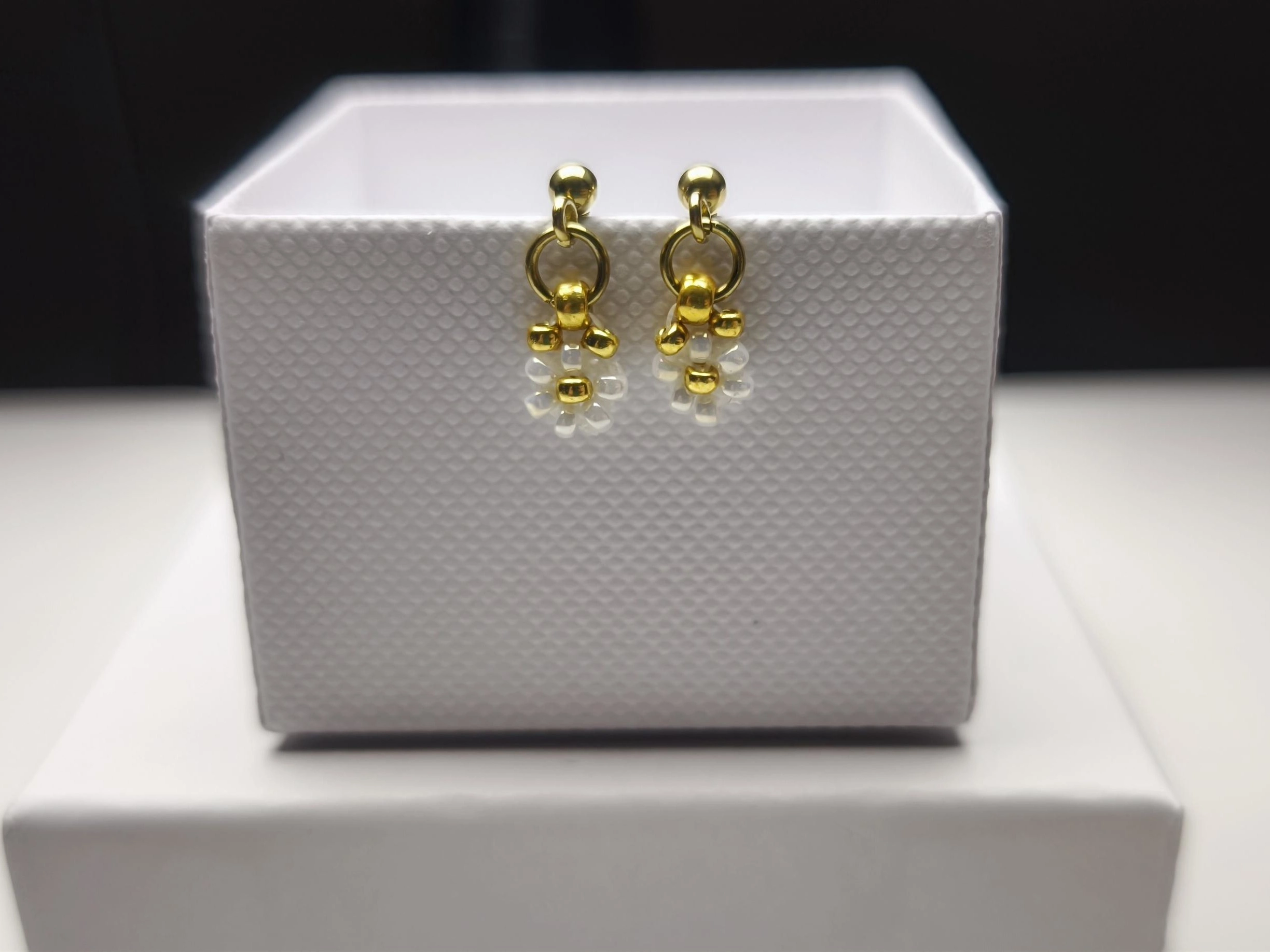 Dominantou těchto náušnic je drobný květinový přívěsek. Každý kvítek je v našem ateliéru pečlivě ručně vyráběný. S trpělivostí a citem pro detail skládáme miniaturní skleněné japonské korálky Miyuki (velikost 2-3 mm) do tvaru dokonalého květu.