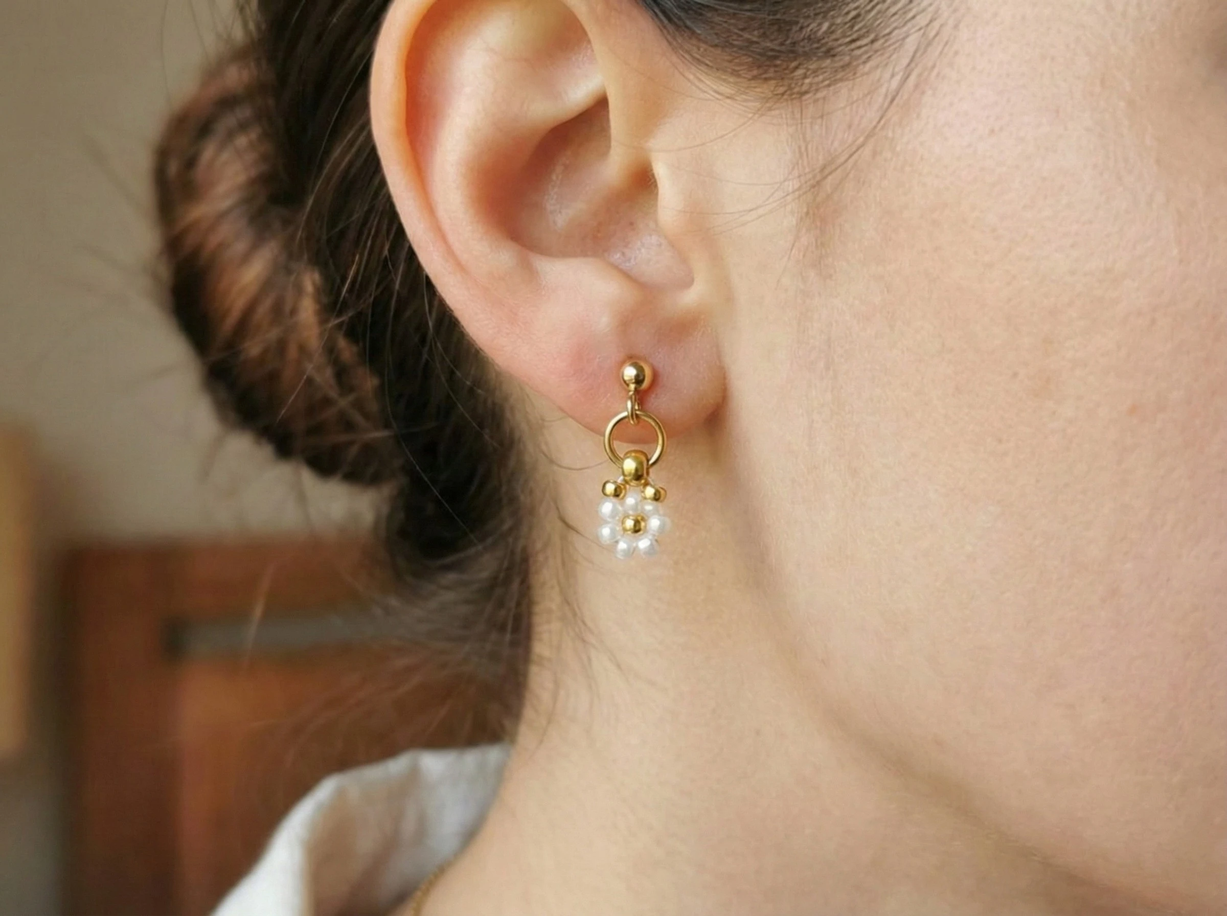 Tento typ zapínání patří mezi nejoblíbenější a nejpraktičtější. Puzetové náušnice (tzv. pecky) se snadno nasazují a díky zarážce (motýlku) bezpečně drží na uchu. U modelu Perlička tvoří základ zlatá kulička, která sedí přímo na ušním lalůčku, zatímco květinový motiv visí pod ním. To vytváří zajímavý efekt – šperk je stabilní jako klasická „pecka“, ale zároveň má hravost visacích náušnic.