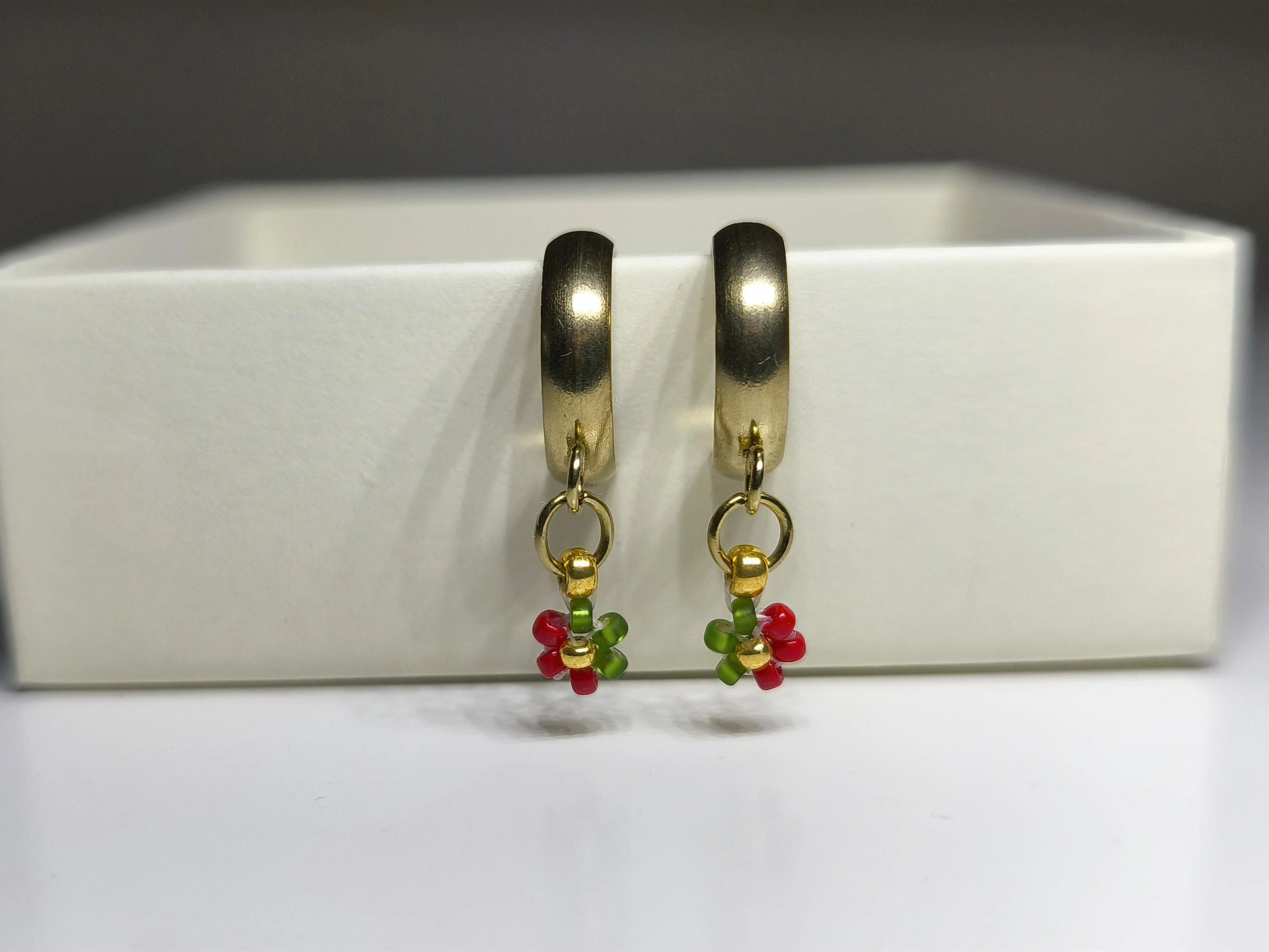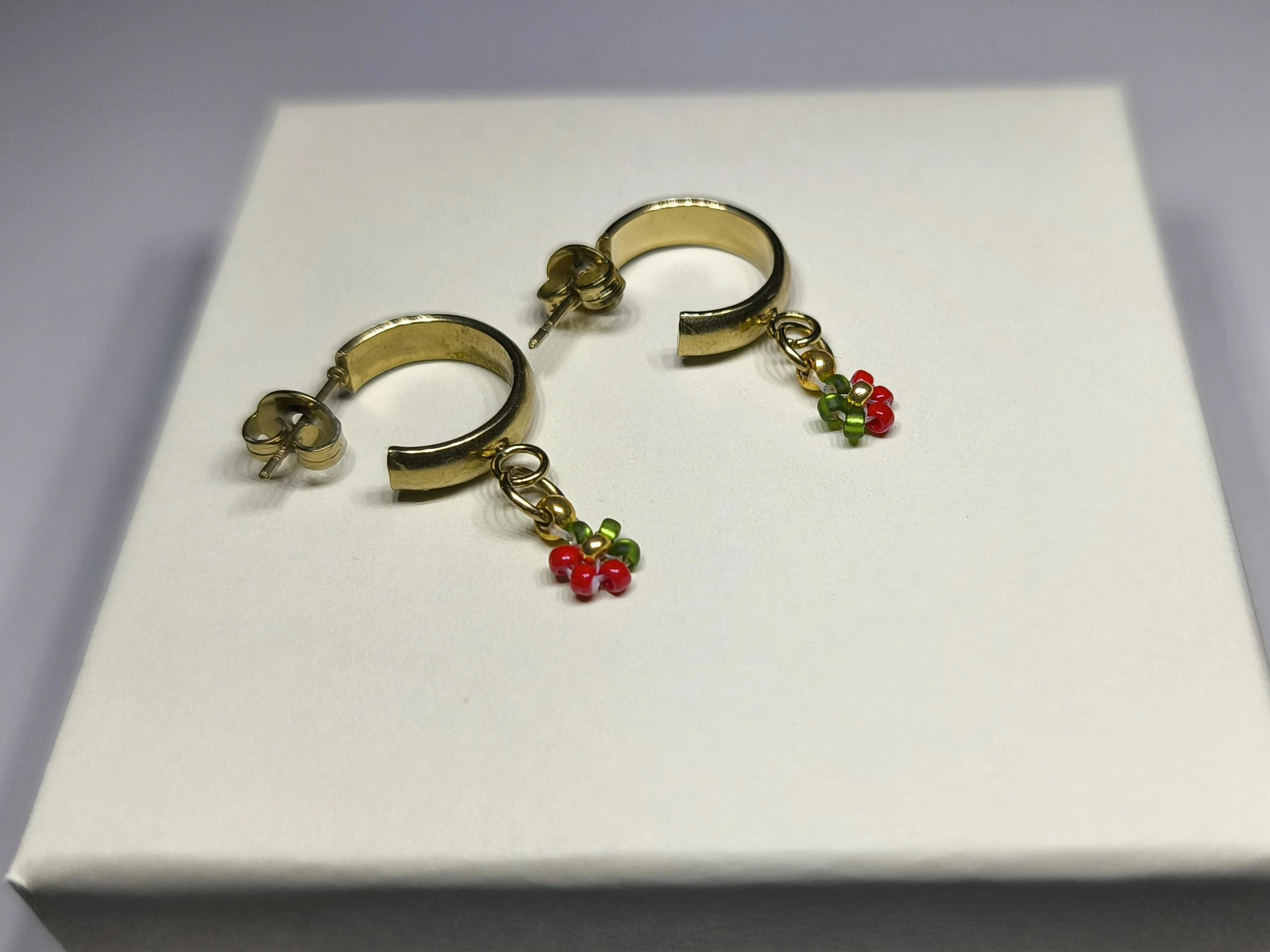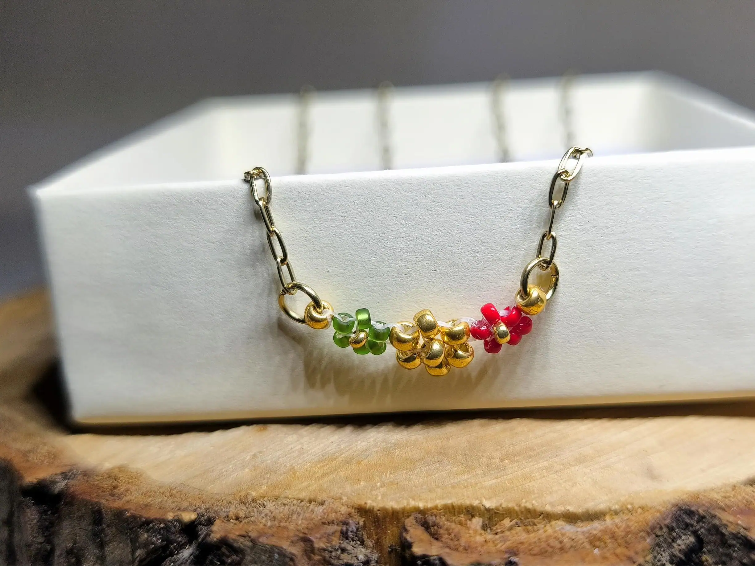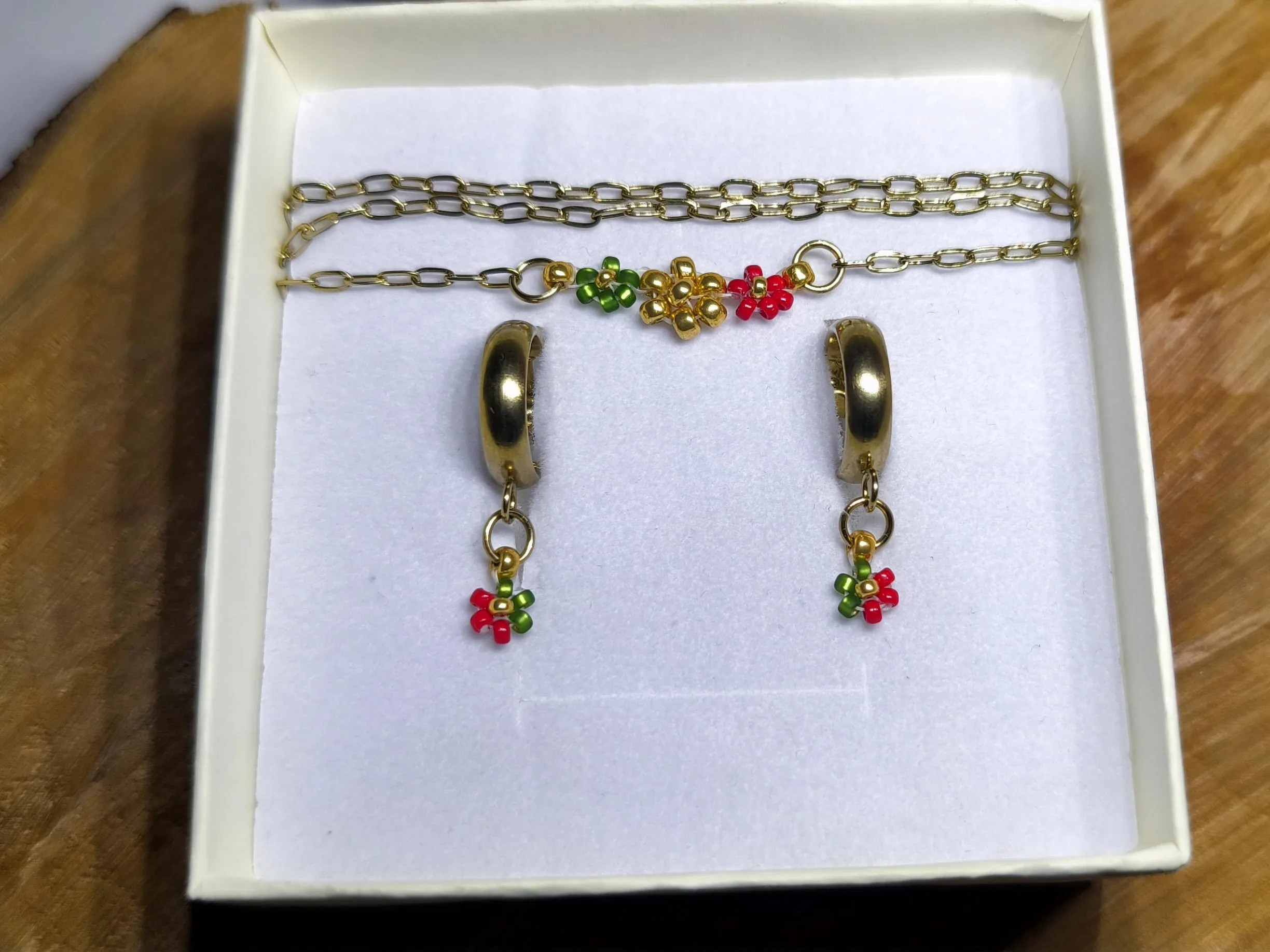 Každý detail je precizně ručně vyroben ze skleněných japonských korálků Miyuki o velikosti 2-3 mm. Ikonická kombinace sytě červené, lesní zelené a zářivé zlaté barvy symbolizuje radost, naději a sváteční pohodu. Šperky jsou vytvořeny na vysoce pevném vlasci značky Fireline, který je zakončen pevným uzlíkem a zajištěn speciálním lepidlem.