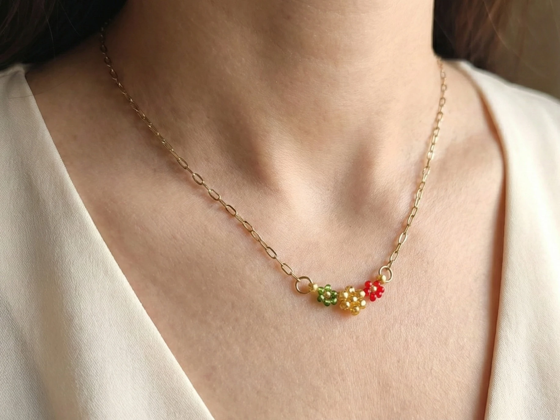 Náhrdelník: Tři drobné kvítky jsou elegantně zakomponovány přímo do jemného řetízku (ocel 316L).