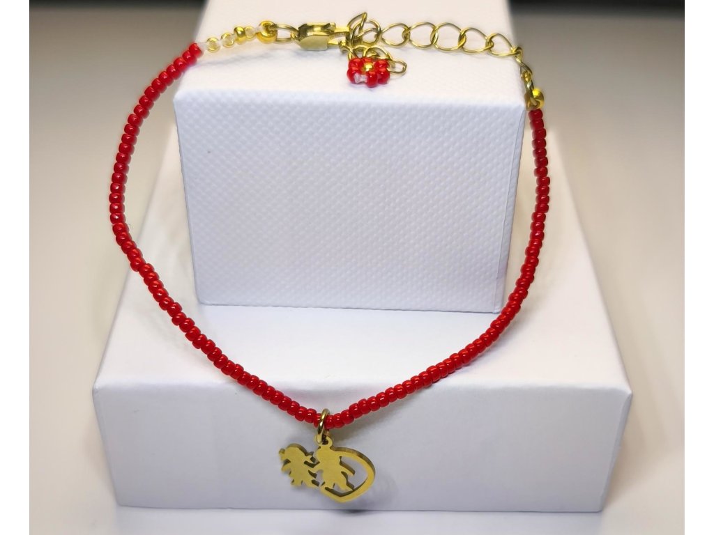 Základ náramku tvoří minimalistická linie sytě červených korálků Miyuki o velikosti 2-3 mm, která působí na zápěstí velmi decentně a elegantně. Hlavní dominantou je zlatý ocelový přívěsek ve tvaru srdce, uvnitř kterého se drží za ruce chlapec a dívka. Jako roztomilý detail je u zapínání přidán drobný korálkový kvítek. Náramek je navlečen na vysoce pevném vlasci značky Fireline, zakončeném pevným uzlíkem a zajištěným speciálním lepidlem.