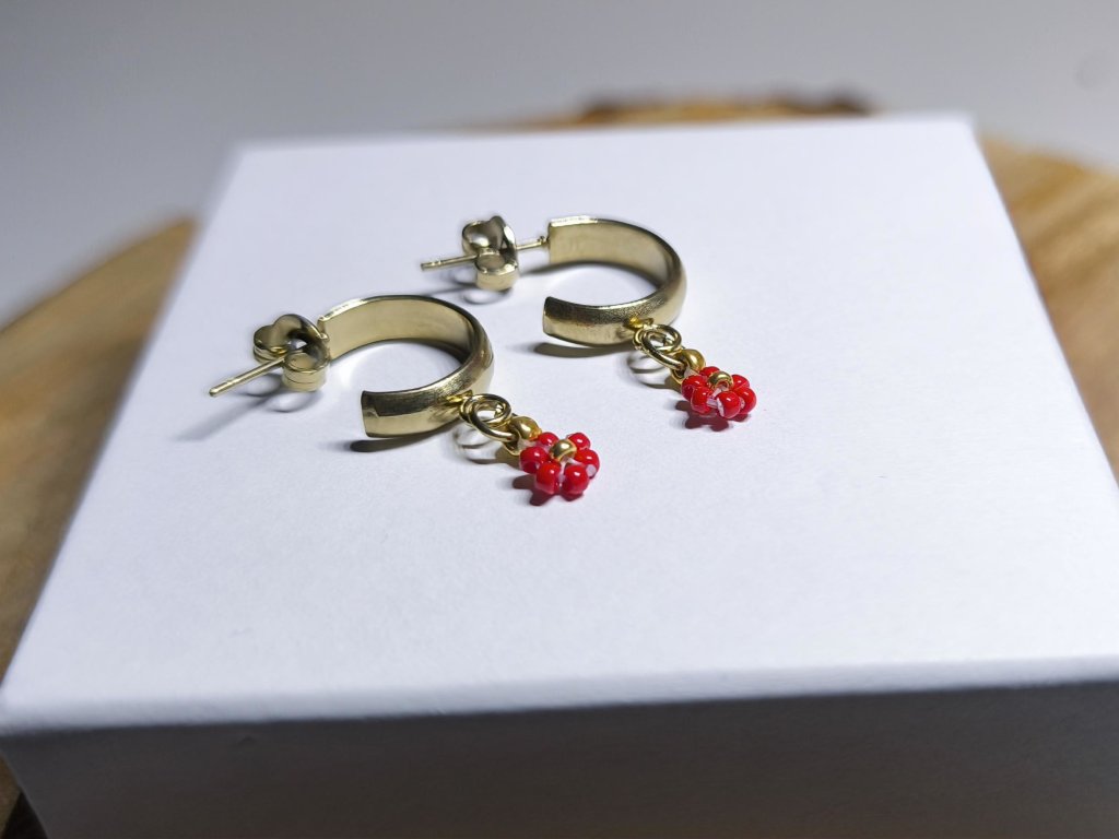 Náušnice kroužky "Vlčí mák" - PVD Gold, Miyuki. Vneste do svého dne vášeň a energii s těmito půvabnými náušnicemi "Vlčí mák". Kombinace zlatého kroužku a drobného červeného kvítku je dokonalým doplňkem, který podtrhne vaši ženskost a dodá vašemu vzhledu výrazný, romantický a letní nádech.