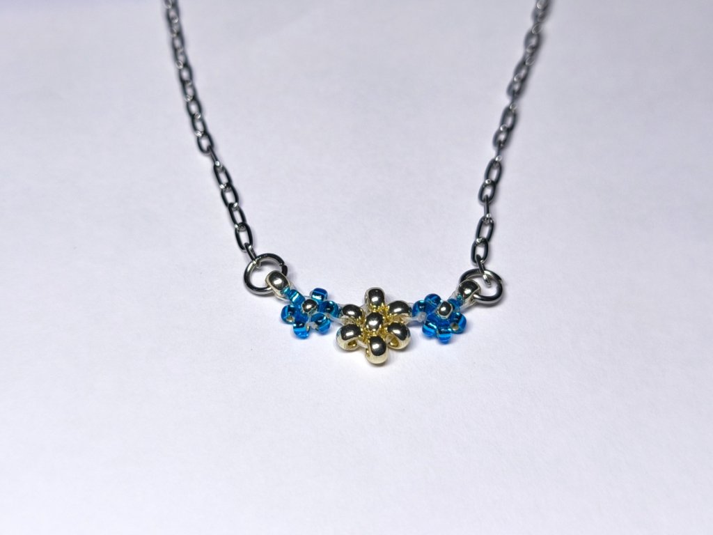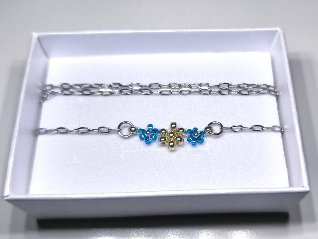Hlavním motivem jsou tři ručně vyrobené kvítky ze skleněných japonských korálků Miyuki o velikosti 2-3 mm. Zářivá světle modrá barva krajních květů v kontrastu se stříbrným kvítkem uprostřed věrně evokuje půvab pomněnek. Kvítky jsou pevně spojeny vysoce pevným vlascem značky Fireline, který je zakončen uzlíkem a zajištěn speciálním lepidlem.