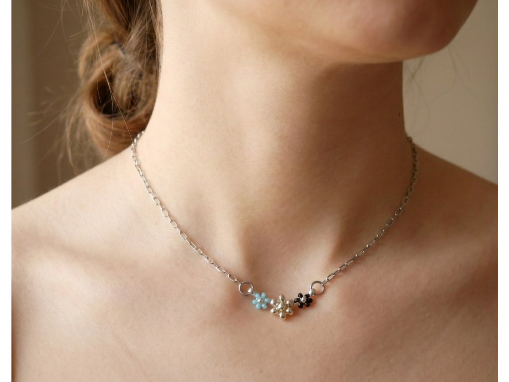 Zahalte svůj dekolt do tajemné krásy noční oblohy s tímto půvabným náhrdelníkem "Půlnoční nebe". Tři drobné kvítky v kontrastních barvách jsou elegantně zakomponovány do jemného stříbrného řetízku, čímž vytváří šperk, který dodá vašemu vzhledu sofistikovaný, magický a originální nádech.