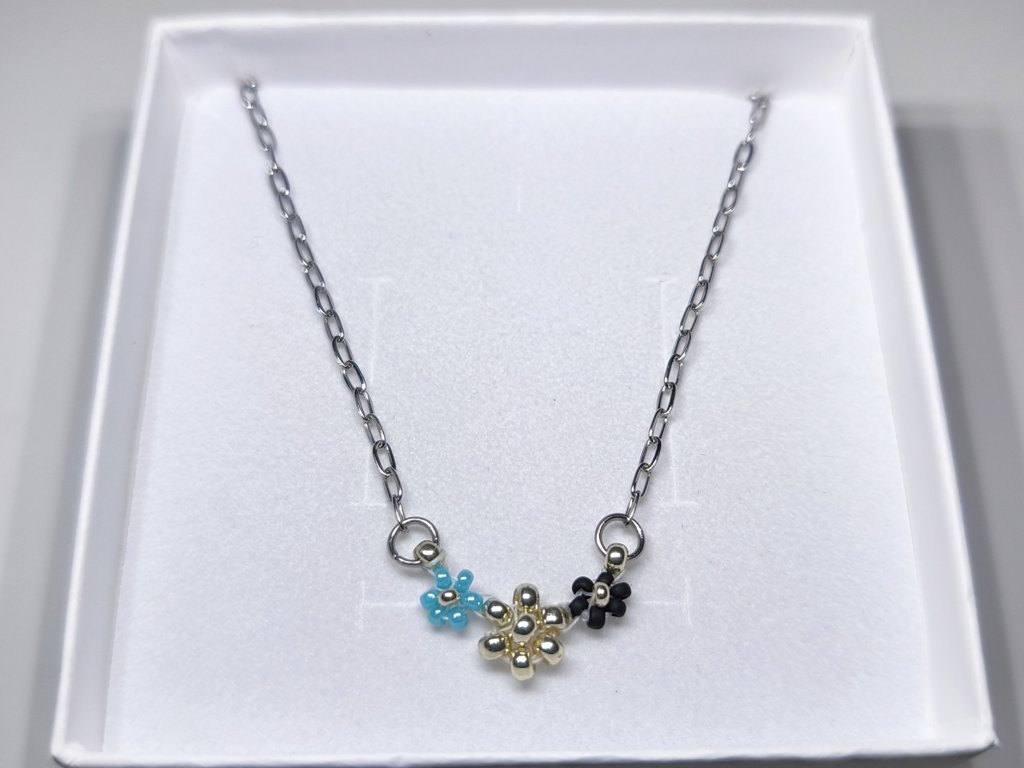 Konstrukce: Motiv tří kvítků je pevně zakomponován do středu jemného řetízku (ocel 316L) pomocí spojovacích kroužků (ocel 304). Náhrdelník je zakončen karabinkou pro bezpečné zapínání.