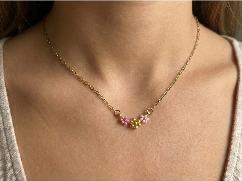 Hlavním motivem jsou tři ručně vyrobené kvítky ze skleněných japonských korálků Miyuki o velikosti 2-3 mm. Něžná pastelově růžová barva krajních květů se střídá se zlatým kvítkem uprostřed (případně zlatými středy), což vytváří velmi harmonický celek. Kvítky jsou pevně spojeny vysoce pevným vlascem značky Fireline, který je zakončen uzlíkem a zajištěn speciálním lepidlem.