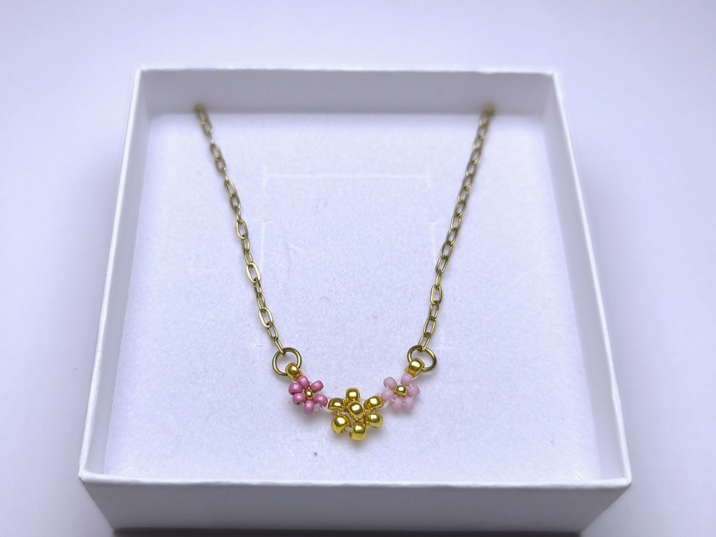 Jemný ručně vyráběný náhrdelník z japonských korálků Miyuki a chirurgické oceli. Elegantní doplněk v barvách jemné růžové a zlaté, který podtrhne váš styl.