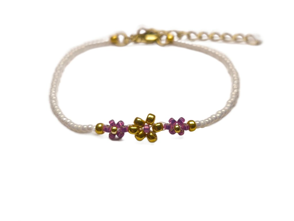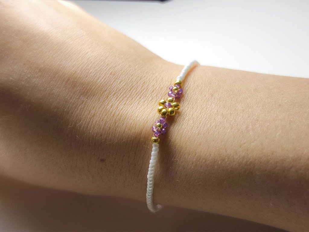 Jemný ručně vyráběný náramek z japonských korálků Miyuki a chirurgické oceli. Elegantní doplněk v barvách perleťově bílé, fialové a zlaté, který podtrhne váš styl.