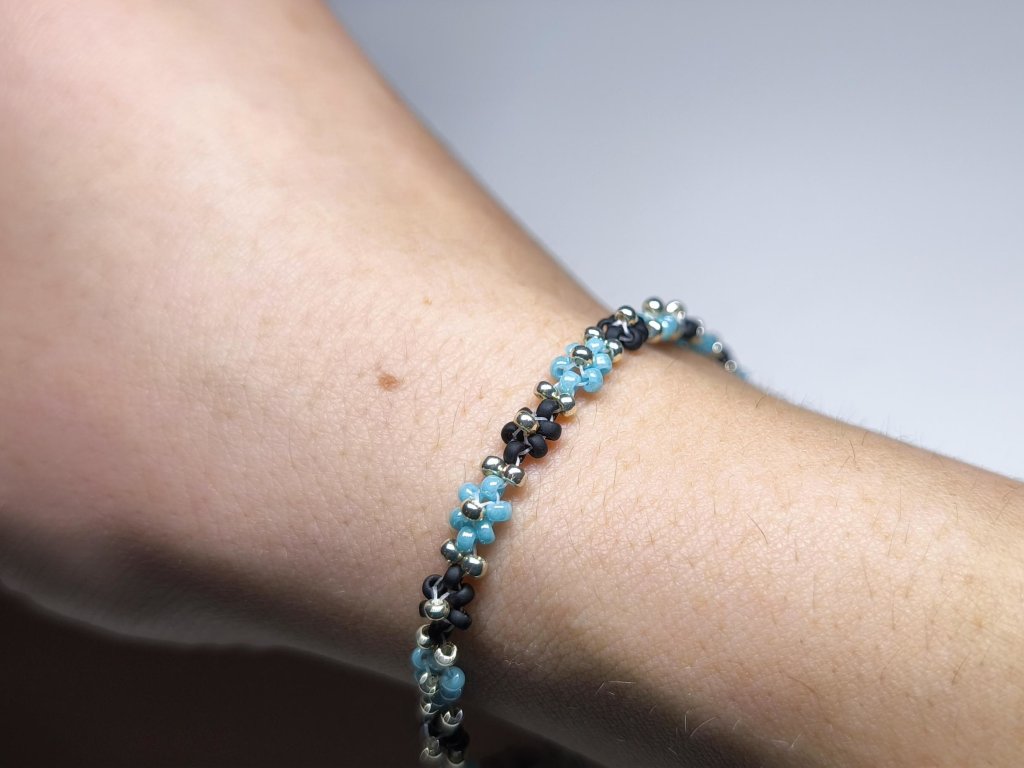 Každý detail náramku je precizně ručně vyroben ze skleněných japonských korálků Miyuki o velikosti 2-3 mm. Výrazná kombinace zářivé azurové (tyrkysové) barvy a hluboké černé se stříbrnými akcenty vytváří efekt hvězd zářících v temné noci. Celý náramek je vytvořen na vysoce pevném vlasci značky Fireline. Pro maximální odolnost a jistotu je šňůra zakončena pevným uzlíkem, zajištěným speciálním lepidlem.