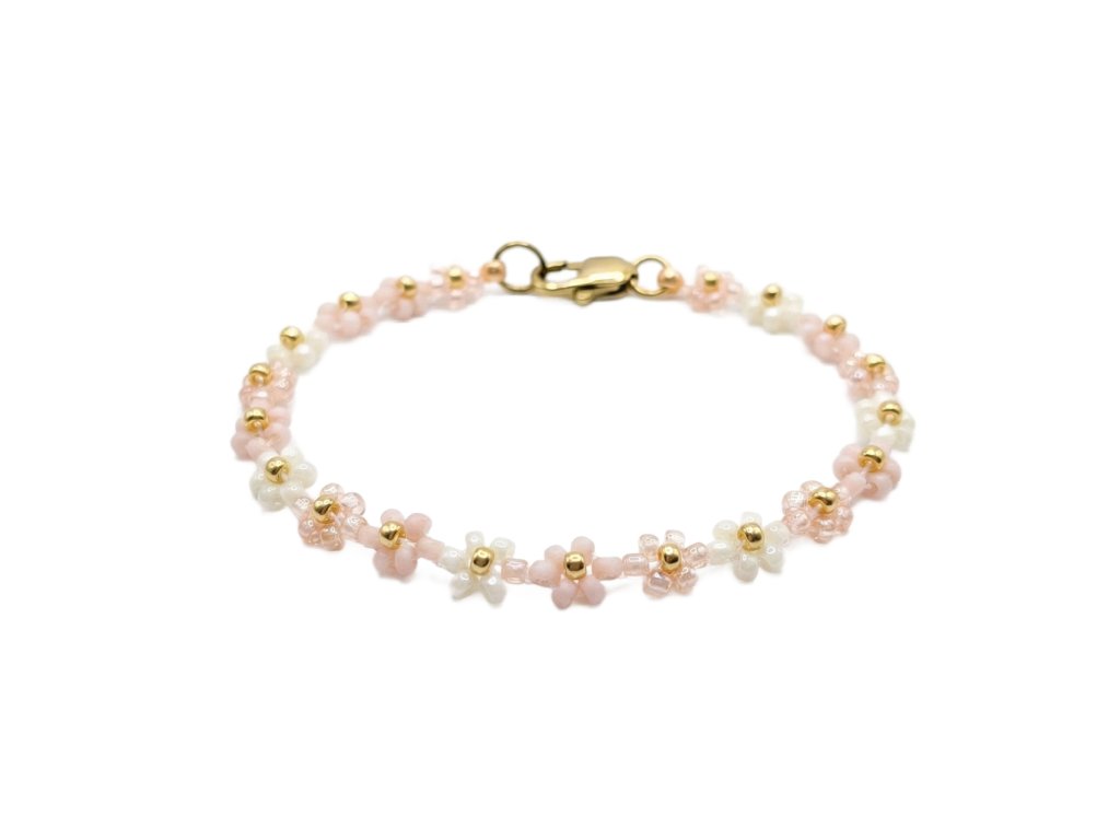Každý detail náramku je precizně ručně vyroben ze skleněných japonských korálků Miyuki o velikosti 2-3 mm. Něžné kvítky v krémové a světle růžové/meruňkové barvě jsou střídány s drobnými zlatými korálky, které celému šperku dodávají jemný lesk. Celý náramek je vytvořen na vysoce pevném vlasci značky Fireline. Pro maximální odolnost a jistotu je šňůra zakončena pevným uzlíkem, zajištěným speciálním lepidlem.