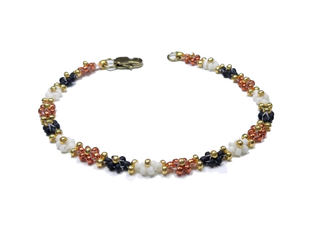 Každý detail náramku je precizně ručně vyroben ze skleněných japonských korálků Miyuki o velikosti 2-3 mm. Působivá kombinace černé, bílé a metalické měděné (rezavé) barvy vytváří jedinečný kontrast, který je doplněn o zlaté akcenty. Celý náramek je vytvořen na vysoce pevném vlasci značky Fireline. Pro maximální odolnost a jistotu je šňůra zakončena pevným uzlíkem, zajištěným speciálním lepidlem.