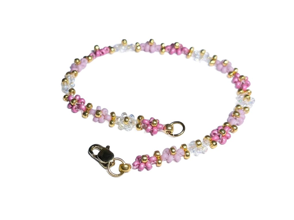 Každý detail náramku je precizně ručně vyroben ze skleněných japonských korálků Miyuki o velikosti 2-3 mm. Půvabná kombinace několika odstínů růžové se střídá s křišťálově čirými korálky a je doplněna o zlaté akcenty, které šperku dodávají hřejivý lesk. Celý náramek je vytvořen na vysoce pevném vlasci značky Fireline. Pro maximální odolnost a jistotu je šňůra zakončena pevným uzlíkem, zajištěným speciálním lepidlem.
