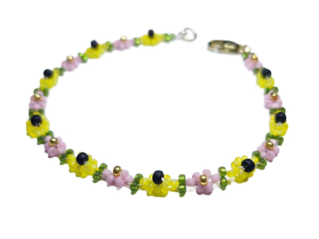 Každý detail náramku je precizně ručně vyroben ze skleněných japonských korálků Miyuki o velikosti 2-3 mm. Zářivé žluté kvítky s černým středem se střídají s něžnými světle růžovými kvítky, propojenými svěží zelenou barvou. Celý náramek je vytvořen na vysoce pevném vlasci značky Fireline. Pro maximální odolnost a jistotu je šňůra zakončena pevným uzlíkem, zajištěným speciálním lepidlem.