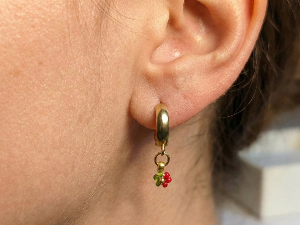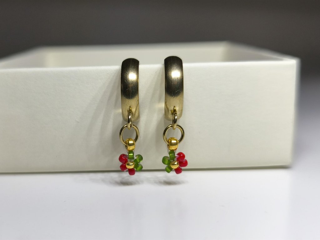 Náušnice kroužky "Vánoční přání" - PVD Gold, Miyuki. Přeneste se do kouzelného vánočního času s těmito půvabnými náušnicemi "Vánoční přání". Kombinace zlatého kroužku a drobného kvítku v tradičních svátečních barvách je dokonalým doplňkem ke štědrovečerní večeři nebo jako dárek, který vykouzlí úsměv pod stromečkem.