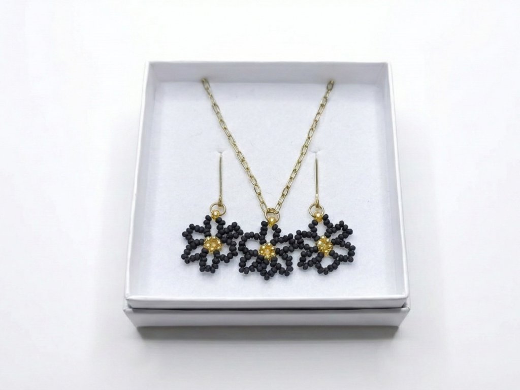 Každý detail je precizně ručně vyroben ze skleněných japonských korálků Miyuki o velikosti 2-3 mm. Kombinace matných černých okvětních lístků se zlatým středem působí velmi efektně a luxusně. Šperky jsou vytvořeny na vysoce pevném vlasci značky Fireline, který je zakončen pevným uzlíkem a zajištěn speciálním lepidlem.