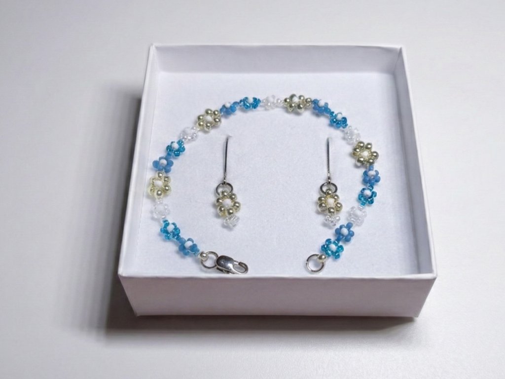 Sada šperků "Ledový květ" - Náramek & Náušnice | Miyuki & Ocel. Dopřejte si dokonalou harmonii chladivé elegance s touto sadou šperků "Ledový květ". Kombinace náramku a ladících náušnic vytváří ucelený šperk, který dodá vašemu vzhledu svěží, jiskřivý a jemně mrazivý nádech. Je to ideální volba pro milovnice čistého designu nebo jako krásný dárek.